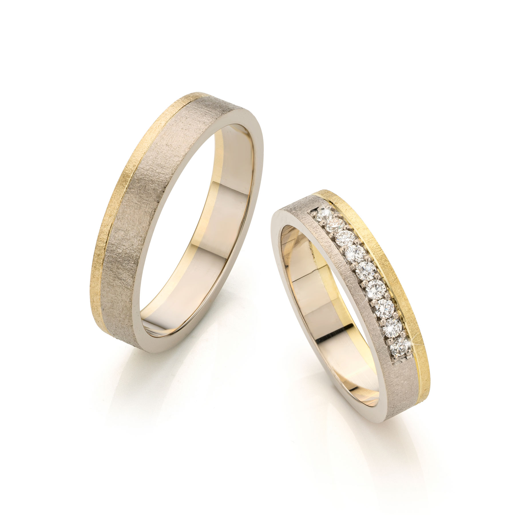 Deze wit en geelgouden trouwringen Heeft een matte afwerking die een moderne en minimalistische uitstraling geeft. De damesring is voorzien van 11 schitterende diamanten die pave gezet zijn. Door de pave zetting liggen de diamanten dicht bij elkaar en vormen ze een continue schittering rondom de ring. De combinatie van het strakke design en de sprankelende diamanten maakt deze trouwringen elegant en tijdloos, perfect voor een stijlvolle bruiloft.